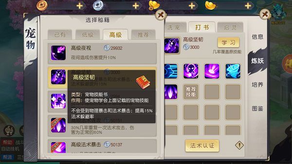 宠物护符方面,建议大家可以根据已经打出的技能自行调节,比如如果打出了高级健体这类主要技能,护符就可以尝试重置出高级涅槃,高级不死,让血宝宝多出第二条命,存活几率更大。