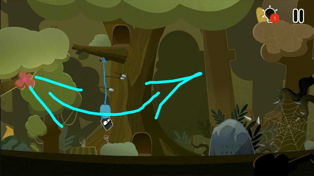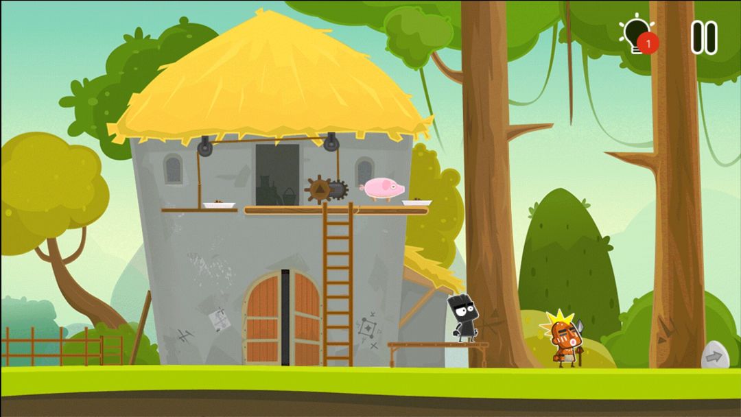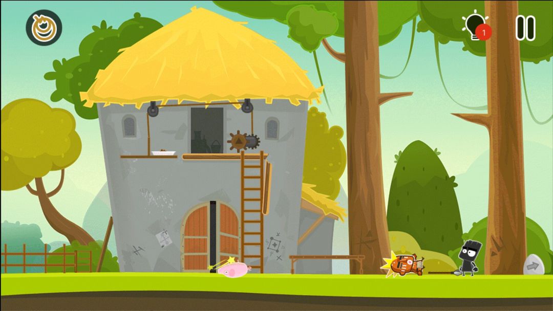 👉小猪掉下来,把小黑弹射到树上