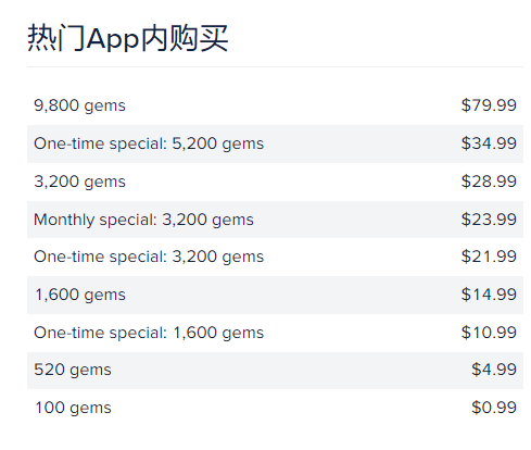值得一提的是,《宝可梦:大师》在日本和中国香港都曾登顶过 App Store 畅销榜,但在美国,这款游戏畅销榜名次仍然浮动在第5和第6。根据 App Annie 显示的热门App内购情况来看,价位最高的9800钻售价79.99美元,而价位最低的100钻售价为0.99美元。