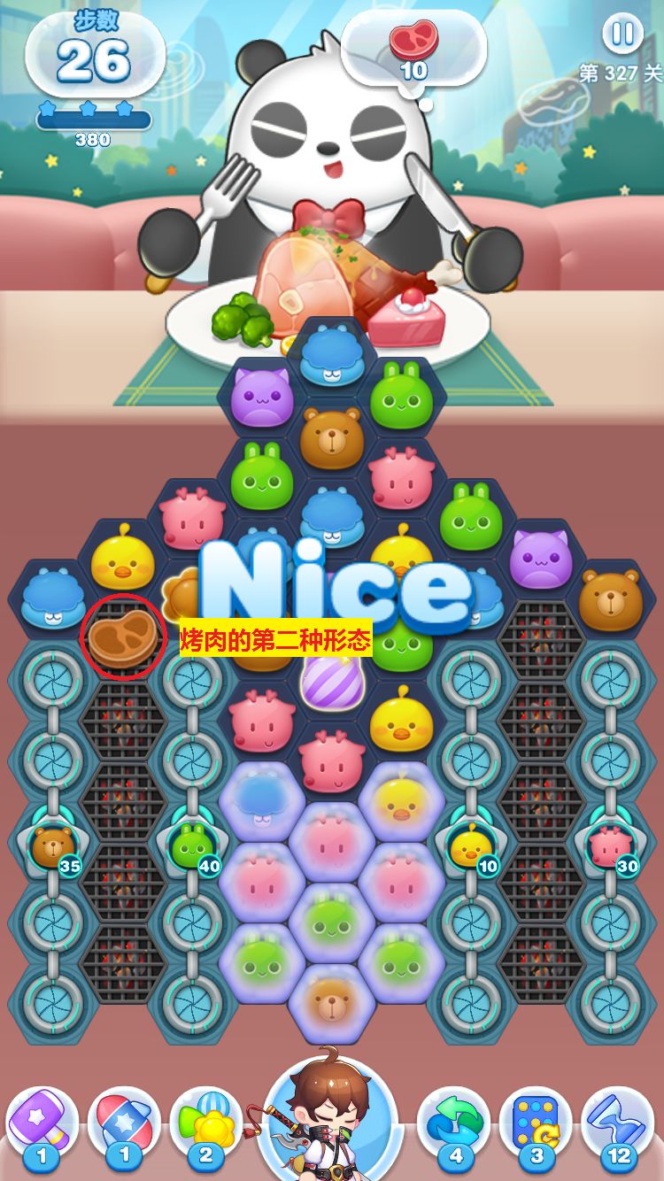 第一种状态:烤肉的最初状态。进入关卡后,是没有肉片存在的,只有一些烧烤架在棋盘上。我们只需要在棋盘旁边进行消除或者用特效炸弹攻击烤肉,就可以将新鲜的肉片放到烧烤架上了。这个时候肉片的颜色是鲜红的,是烤肉元素的第一种状态。