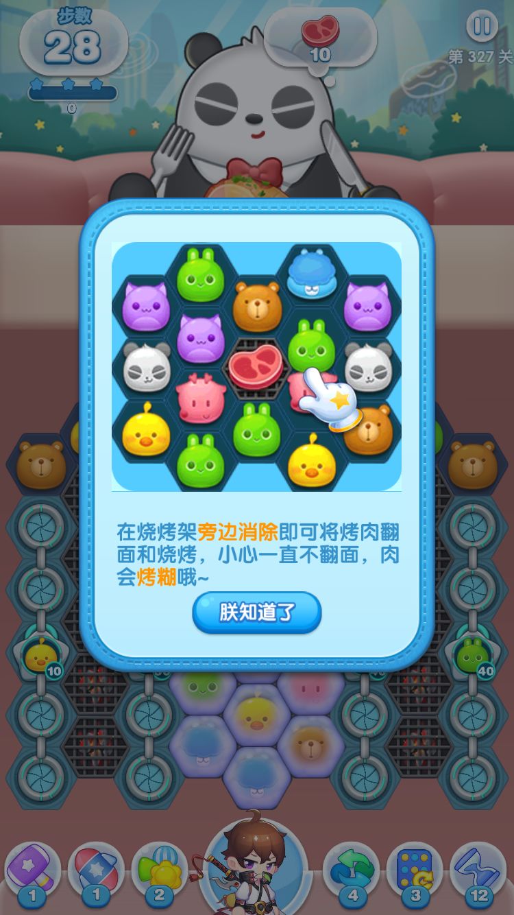 第六种状态:烤肉全糊,这是烤肉的最后一次挽救机会了,如果还是没能在其旁边进行消除,那么烤肉会消失,前功尽弃。