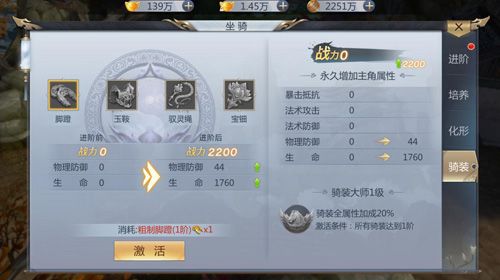 最后,骑装可以对坐骑进行进一步的培养,这就像是专属于坐骑的装备。通过装备升级整套的骑装,还可以获得更多的属性加成哦。