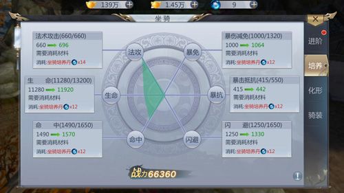 在培养中,可以对坐骑所提升的属性单一进行提升,可以进一步的自定义培养。使用培养丹可以对攻击、生命、命中、闪避、暴免于暴抗进行提升,等级越高所需要的培养丹也就越多。