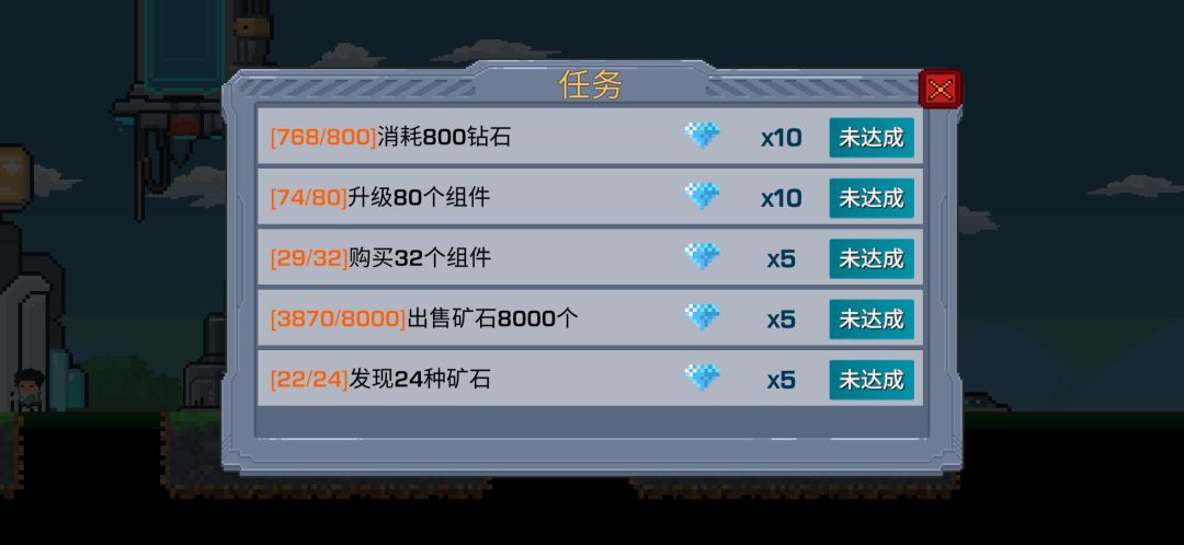 玩了5,6天了,矿车差无畏套装,其他全齐,感觉飞行器买了只是为了有套装效果,没有其他用处,有点鸡肋,若果不是为了往下挖得快我就一直用巨人套装了,毕竟横着可以挖两排,其他的自行体会,目前没遇到任何bug,最后两种矿石要我往下挖多少啊