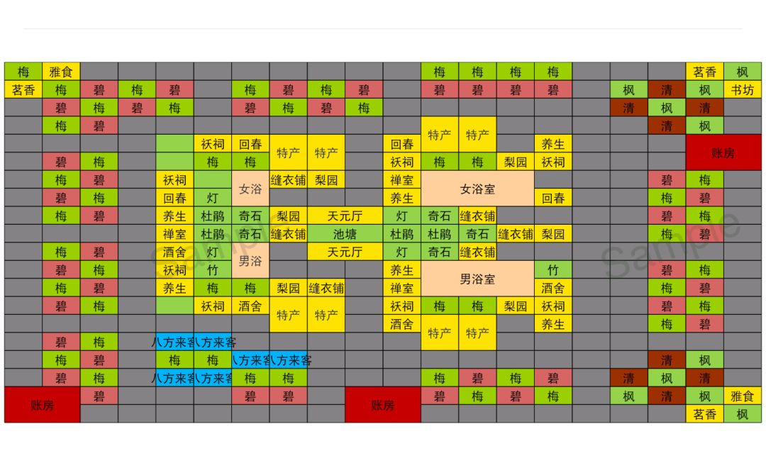 温泉物语里就改过这个布局,因为实在是太喜欢植物与房间交错排列的设计了。这个布局全功效,基本没有debuff,唯一的客人下降出现在特产铺+卧房的青年客人上升,其他客人下降里。是我能做到的最优了,有更完善的布局方式欢迎回复提醒我。表格是用手机做的,比较粗糙,没办法显示行列数。