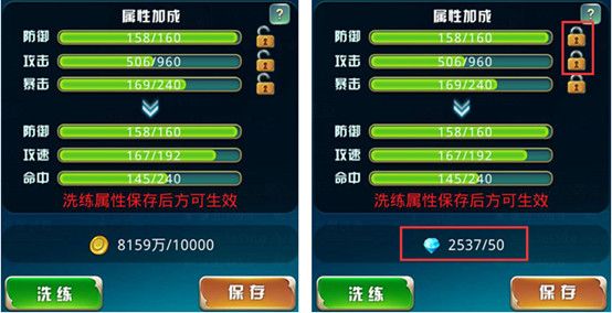 精炼:消耗金币和钻石,提高属性加成,3阶开启第二属性洗练,5阶开启第三属性洗练,锁定其中一个属性,则需要消耗钻石。
