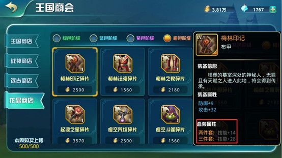 龙晶币可购买绿色阶级装备碎片、蓝色阶级装备碎片(龙穴迷宫通过10层可购买)、紫色阶级装备碎片(龙穴迷宫通过20层可购买)、橙色阶级装备碎片(龙穴迷宫通过30层可购买);蓝色阶级以上的装备,拥有套装属性哦!