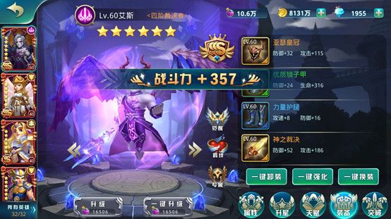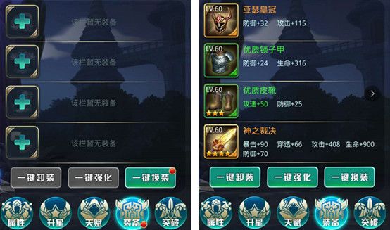 强化:消耗金币进行装备强化,可以提升装备等级,一键强化自动升到最高等级