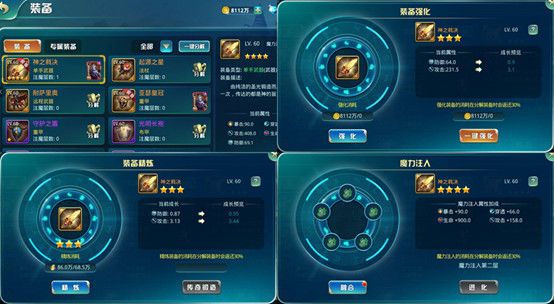 注魔:消耗邪恶魔力材料,装备需要强化到3星后才可以进行魔力注入,魔力注入的数量和可注入层数与装备品质相关,魔力注入可以提升装备额外的属性加成。
