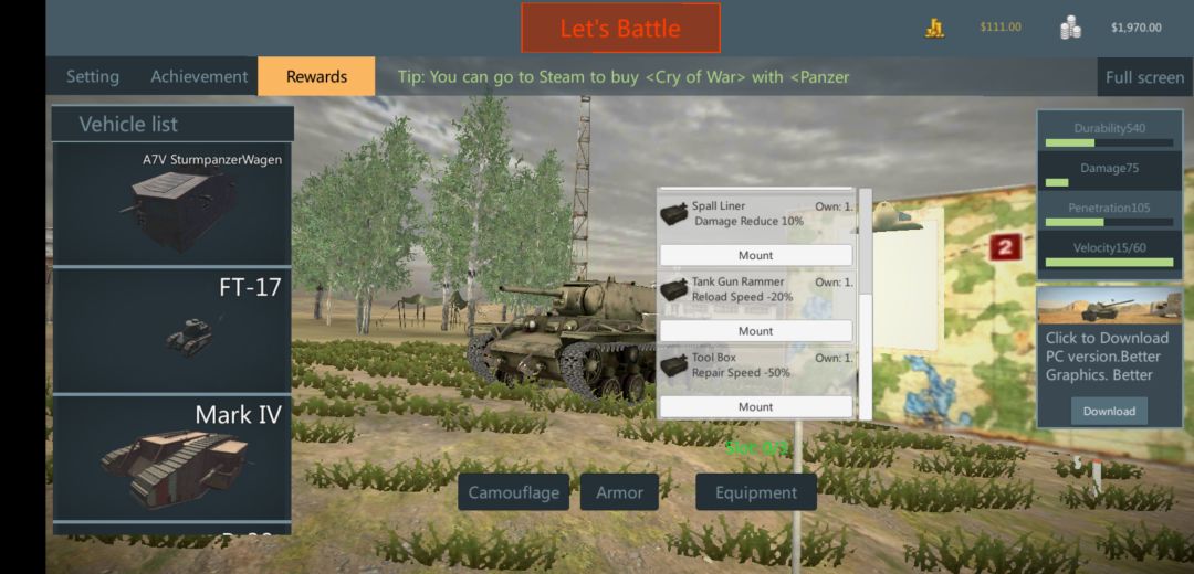 每个坦克可以装配3个插槽的配件。每个配件安装后,只可以通过销毁方式,卸载配件。