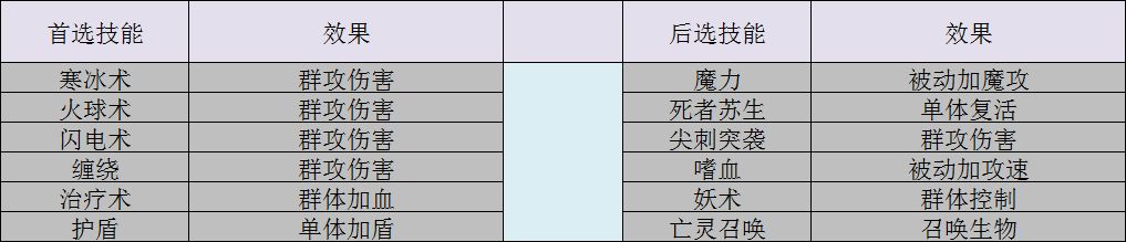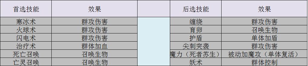 分析:寒冰术、火球术、闪电术是法师的核心输出群攻技能不能丢,召唤流又怎么能少得了亡灵召唤+死亡召唤,配合高级治疗术召唤的生物超难死。