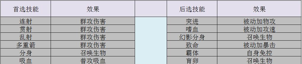 分析:连射、贯射、乱射、多重箭是核心输出技能不能丢的。分身可以变相的增加输出,吸血则是唯一的续航能力。