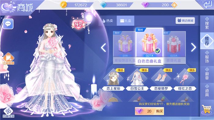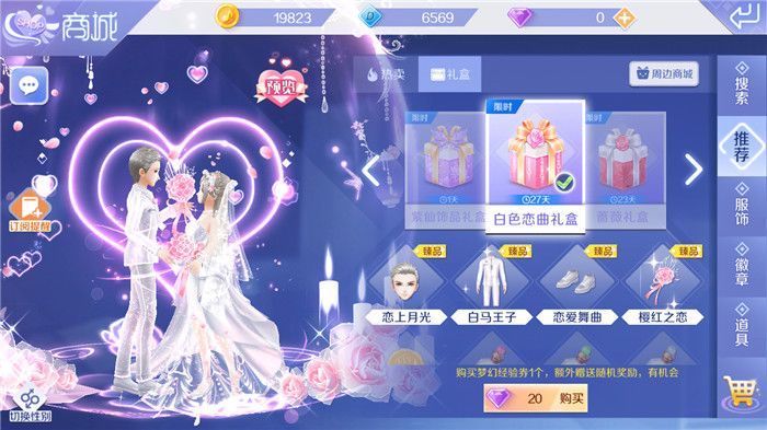女生礼盒中的搭配套装比男生更华丽一些:“恋上星辰”发型、“白雪公主”套装、“恋爱旖梦”鞋子和“绯红之恋”手持等。这款发型十分具有公主范儿,银色披肩长发搭配齐刘海,配上长长的头纱,十分有小鸟依人的感觉;这款套装是一款白色抹胸婚纱,外层是错落有致的蛋糕形裙摆,里层是修身的鱼尾裙,齐地的裙摆是若隐若现的薄纱,代表了每个女孩的公主梦。