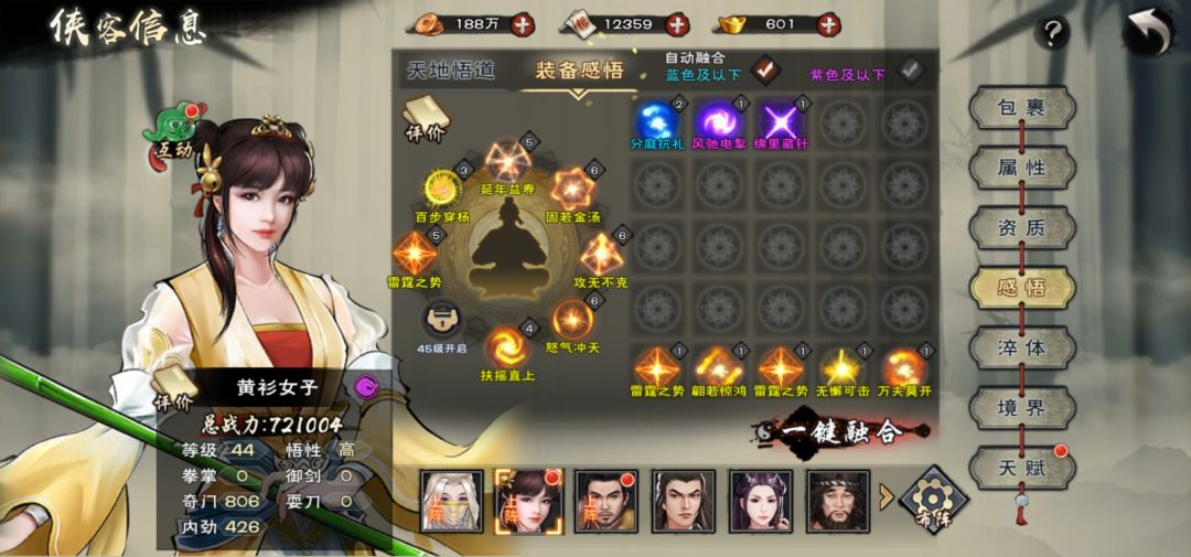 然后就是淬体只有有烧鸡扫荡副本根本不缺平均养成吧!然后技能点优先黄蓉,剩下的给郭靖然后主角。然后境界优先黄蓉10级在另外两个,另外两个10级继续黄蓉。丹药要买看自身条件买吧。然后是感悟前期是大坑,最好不要买感悟香等级越高出货概率越高后面都用不完。感悟优先攻击,防御,血量,怒气,身法,命中。看条件升吧尽量都高一点