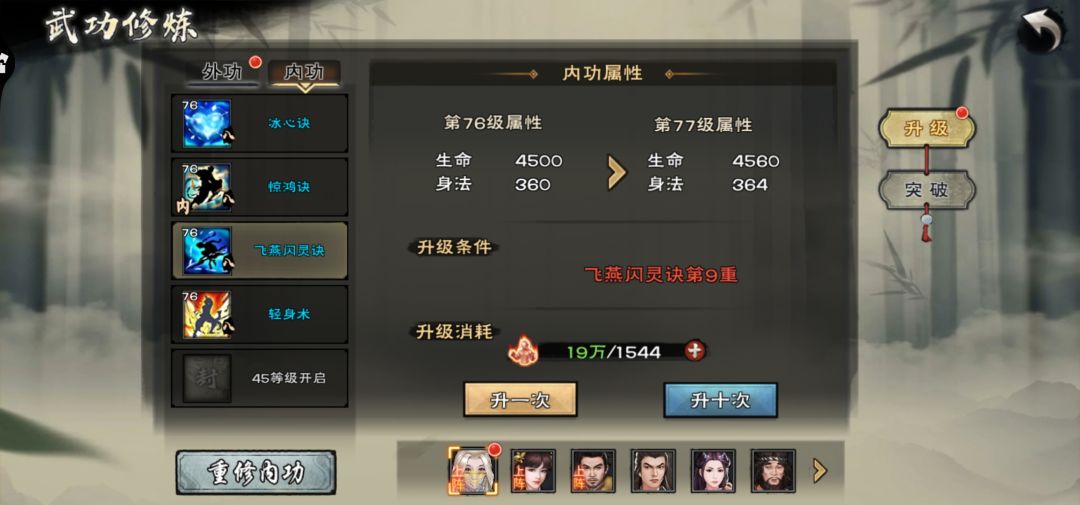 现在看看许多萌新关心的武功方面,声望一般买一些特殊的武学和乙角色自带的紫外功和紫内功的残篇,我们尽量不浪费。前期进入妙音,我们主角奇门带上昙宗这是第一天,让昙宗和主角学妙音或者过度的金币武学,很多过度的金币武学找一些合适的过度外功和内功。等到了第二天郭靖上场也是这样但是前期优先升满一个角色的内外功,一般选择昙宗,因为前期硬一些,黄蓉上场他使命就结束了,