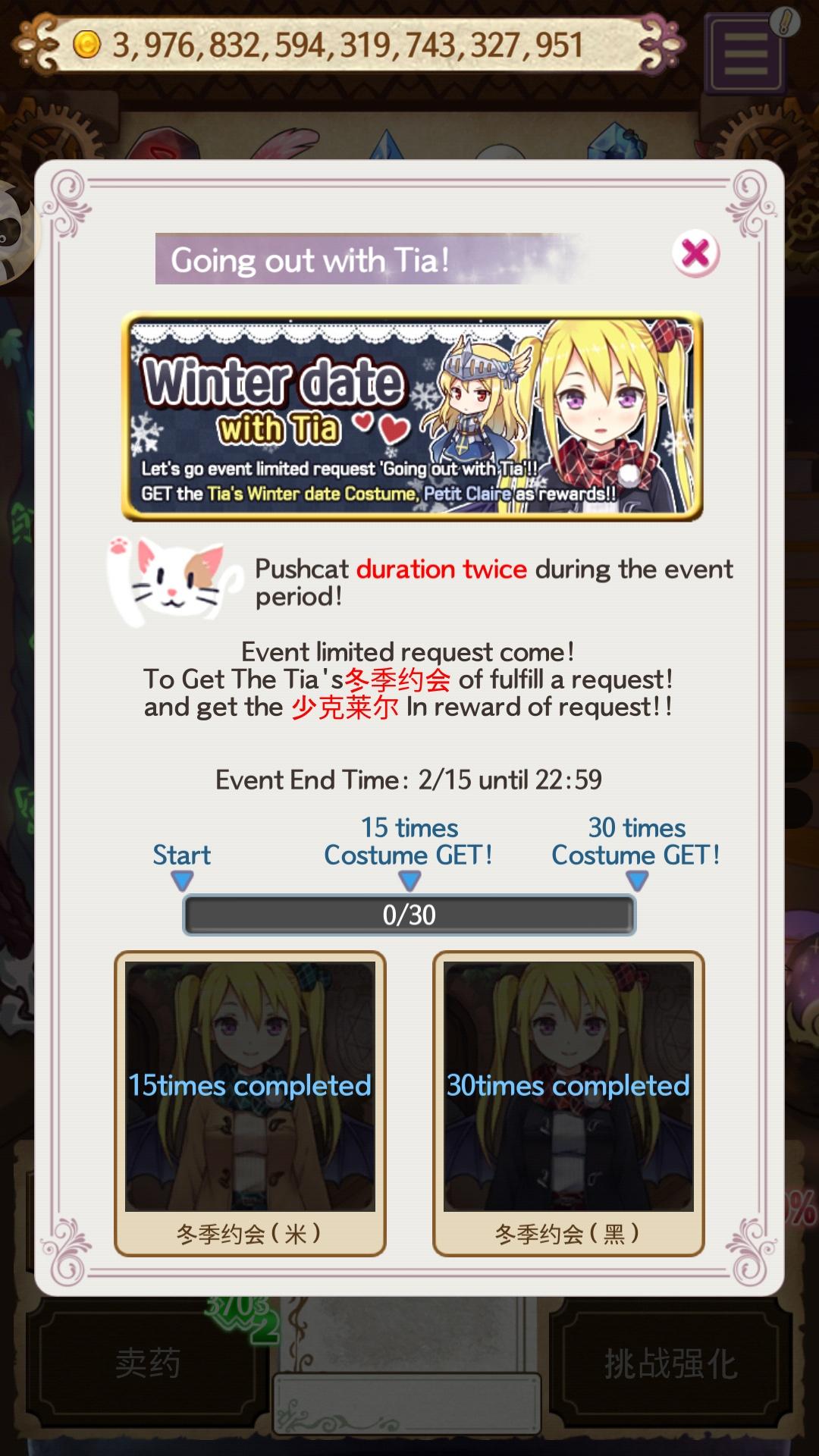 完成30次委托可以获得Tia的“冬季约会(黑)”