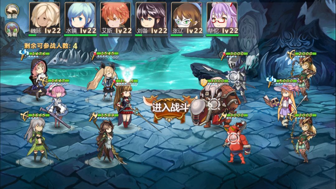 第一波张辽攻击第一排的第一个枪兵如果三心更好了,直接用二技能蓄力,然后魏延一技能给第一排的弓兵,刘备艾斯打弓兵就行了,女仆有一技能就用一技能攻击后排,黄忠打3500血的枪兵,第二回合用一技能就行了,之后就不难打了(千万别用近战角色打枪兵,会被秒的)