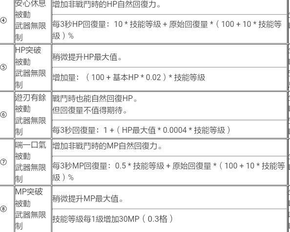 回气(消耗20点技能点):满级20%几率回复100MP。