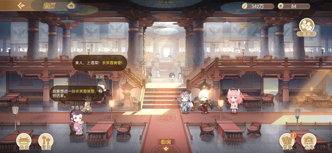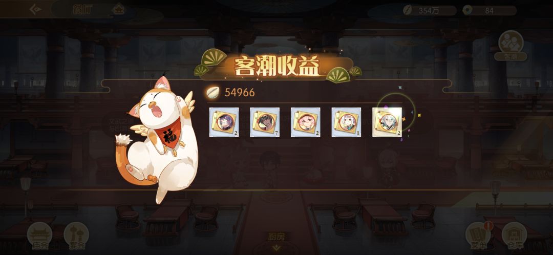 客潮中有概率会出现特殊的客人【财神】,给财神上菜一定会获得御品的食魂碎片(一定要给财神大佬菜吃,为了截图没有点到财神😭)