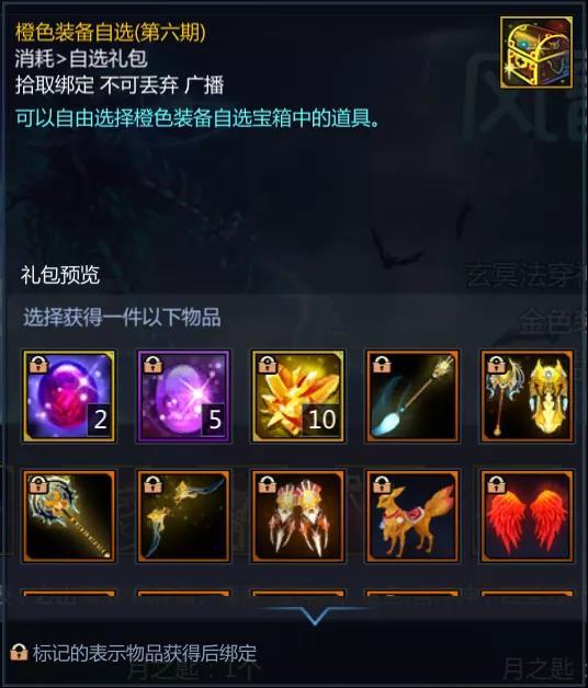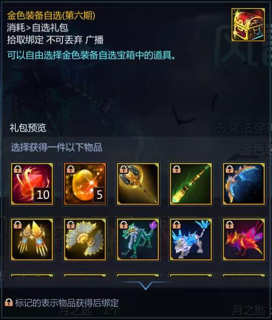 在第六期的金色装备自选中,延续了第五期中的内容,所以大家依然有机会获得淬神系列武器,除了淬神系列武器,四圣兽五行翼等也依然存在于宝箱中。