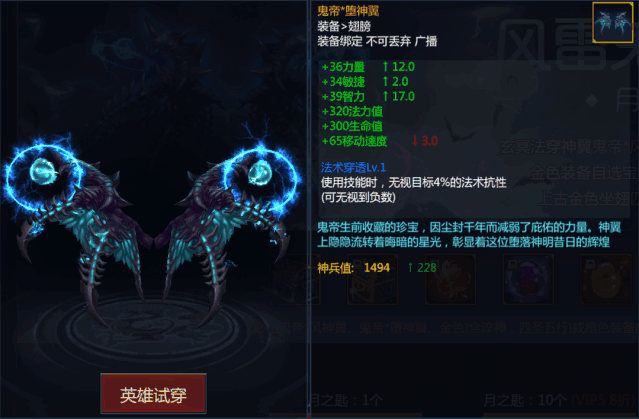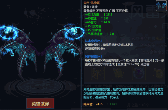 除了带来丰富的属性加成,二者皆能够让英雄在使用技能时,无视目标的法术抗性,而鬼帝*风神翼更是能够在战斗中释放【雷鸣旋风】,对前方直线上的敌人造成伤害。