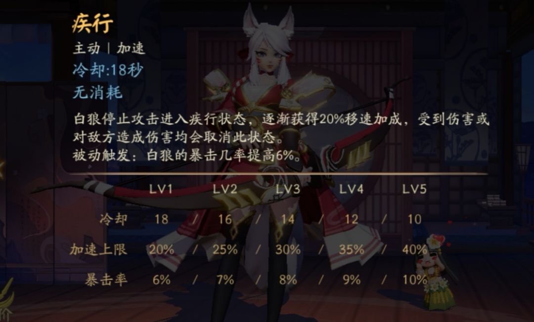一技能:加速,白狼快速支援队友的关键,以及暴击率的额外加成。