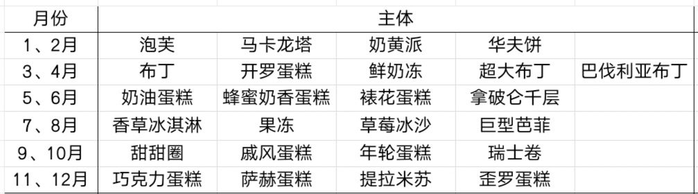 ②原始主体的流行月份见下表,单品流行极限为甜、浓郁、各系材料都添加过,甜+浓郁=无微妙、超甜+清脆=少微妙, 在最终主体上奶油系、砂糖系、巧克力系、水果系同时存在能显著增加流行月份