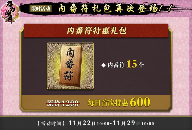 【活动详情】活动期间,内番符特惠礼包再次限时上架万屋。礼包内含内番符*15,原价1200甲州金,每日首次特惠价格600甲州金。使用内番符,加速刀剑男士能力的养成吧!