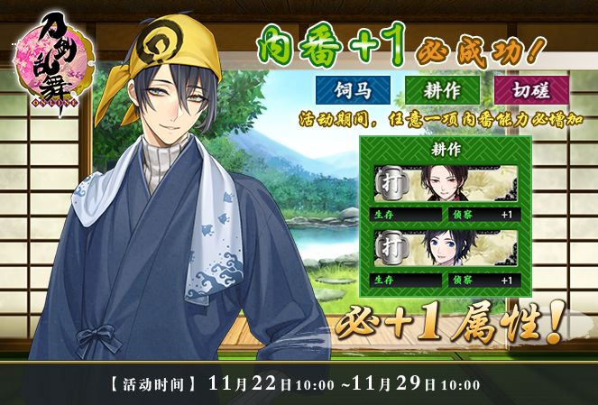 【活动详情】活动期间,刀剑男士所开展的内番活动完成后,任意一项对应能力必增加1点。与此同时,每日内番加速次数上限增至MAX!