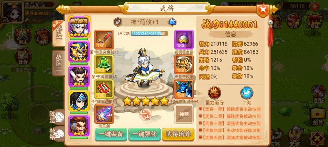 第四阶段 五子 五虎 五谋 推荐阵容依然不变,白马先手冰龙控就能打过 荀攸 曹操 甄姬 张辽 乐进或典韦,这套阵容优点就是省资源,都是常见武将 其中荀攸特别容易获得,5星被动30%智力前期推周快,主动技能40%武力也是一个不错的辅助。