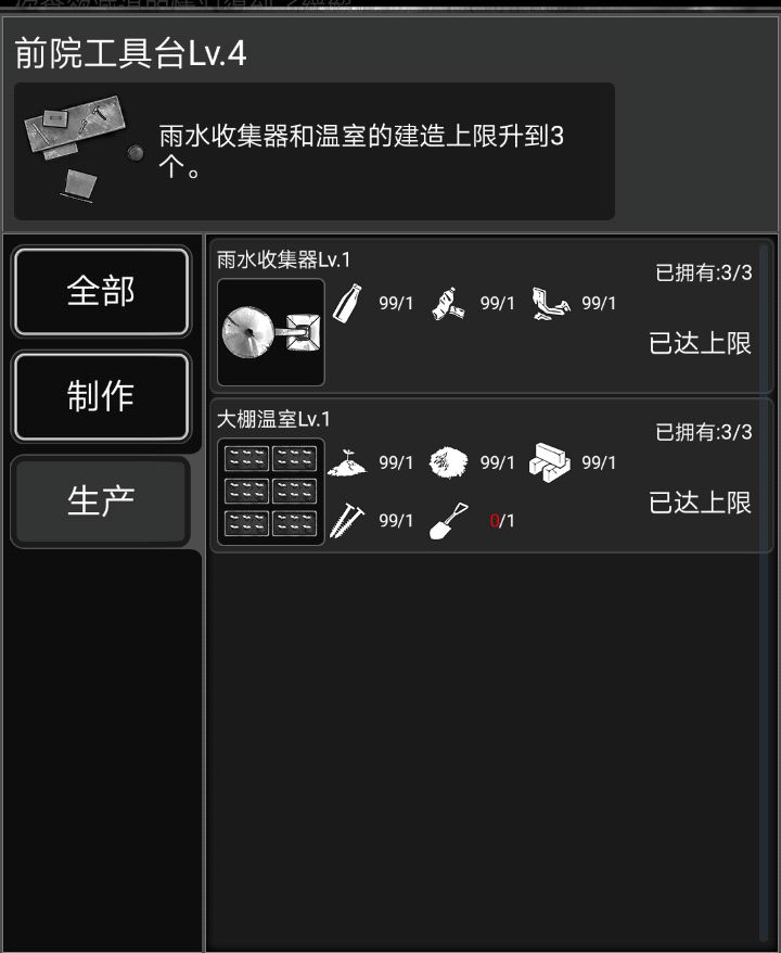 这个时期要做的就是升级家具,积攒材料和子弹,这时候已经可以适当打尸潮刷6血了,尽量每天左右出去搜索一次,这个时候如果缺少电子零件可以购买商城中的