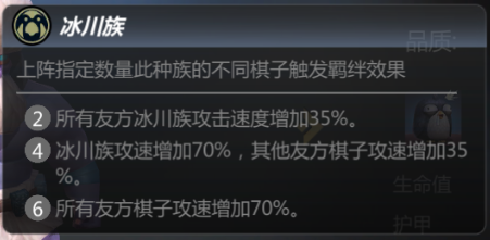冰川族:冰川族成也这个赛季的热门种族。新职业巫师的出现,让激活3层羁绊成为了可能,所以冰川族的全体增加攻速效果,变得非常给力。