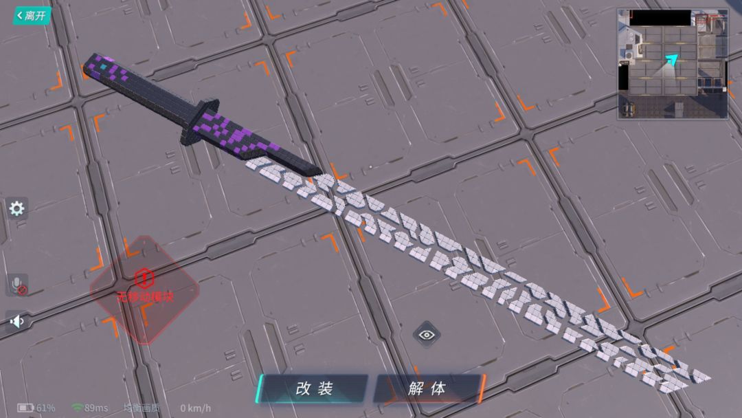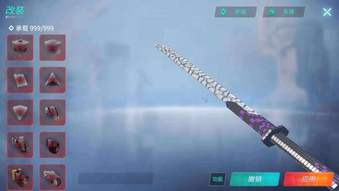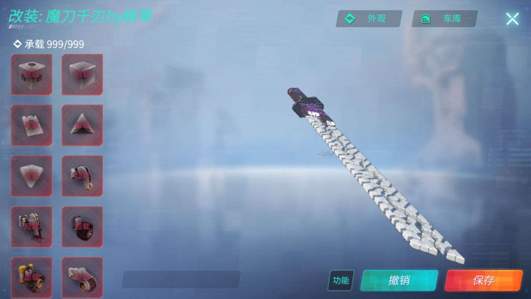 刀身的碎片不小心做大了,不过也没办法,载重实在是不够了,可能到时候我还会重新优化一下,比如适当把碎片缩小,或者把连接处再改改,尽量省下较多的方块来增加刀身的长度。