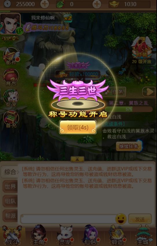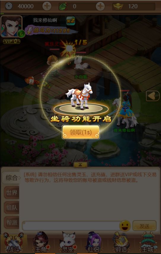 通过做任务和上仙们聊聊天就轻松的获取了大量经验和元宝银两,原来修仙是这么容易的事情啊!角色的等级也在不知不觉中提升到了6级并且获得了小白马一匹,小白马可以通过进阶变成其他的形态,战力属性也会大幅增加,终于不用再用两条腿来回跑路了。