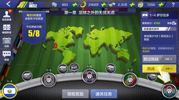 环球挑战赛也是我们提升实力的途径之一,但是这个挑战强度跨度较大,适合长期进行。比赛分为好几章,每章有10个关卡。我们首次通关与完美通关都将获得丰厚奖励,例如我通过的第一关就获得了技能升级券(提升球员技能)、球队基金(发展俱乐部)、球队荣誉(提升主教练顾问团队)。这些可都是提升实力的好东西!但是我们每天的挑战次数有限,所以要慎重选择,可以根据它的推荐战力决定是否挑战。我个人认为战力相差太多就不要浪费机会了,提升好实力再来挑战!
