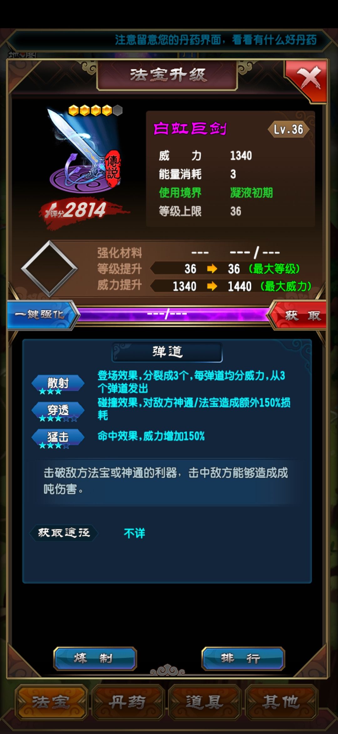 然后我推荐的法宝就是在凝液巅峰以下用白虹巨剑能乱通那些关卡,白虹巨剑的合成方法是符剑➕白虹剑➕射阳箭灵化而来,现在活动有送碎片,可以积极参与,提高法宝质量你就能安稳度过凝液期!如果实在做不出来,瞧瞧告诉你三星的青竹剑在这个阶段也很好用哦!