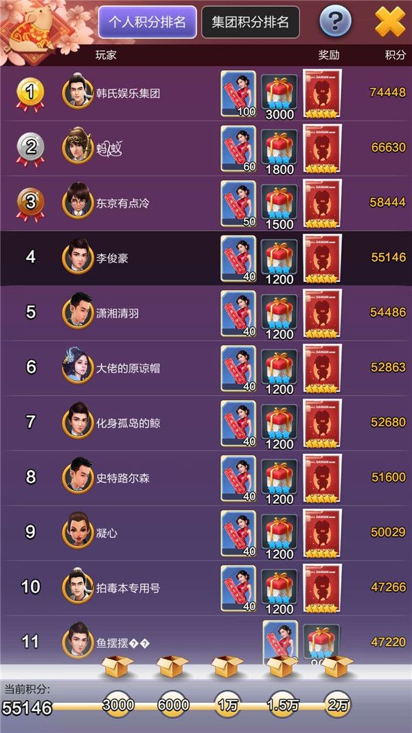 1. 个人排行榜根据所获得的春节积分道具数量来进行排名,集团排行榜根据集团所积累的春节积分。