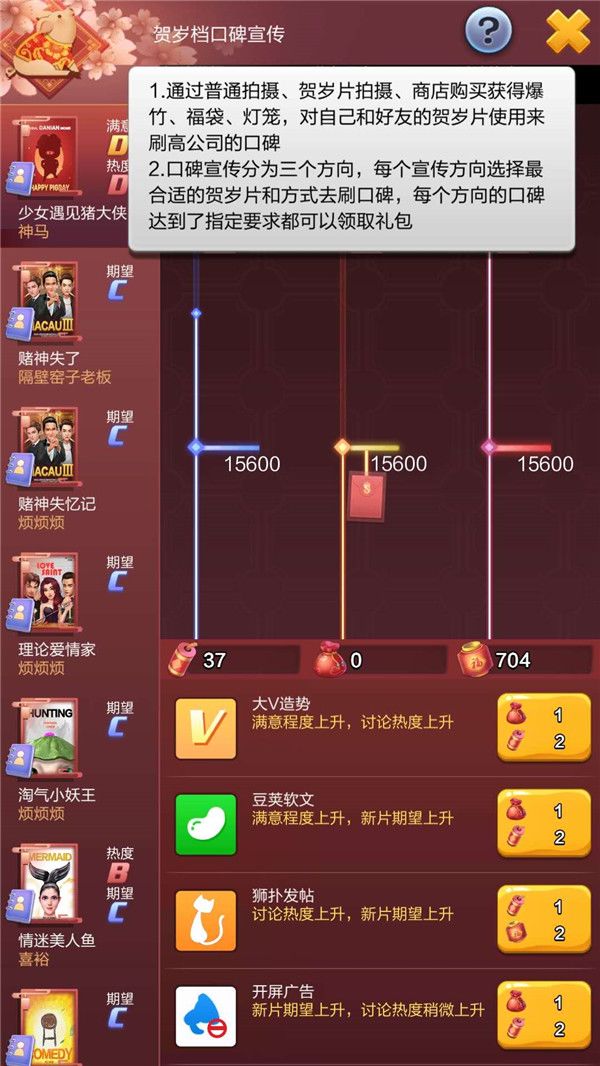 1. 每次活动时系统会分配一部贺岁片进行拍摄,贺岁片可以多次使用好友客串艺人,每部贺岁片分别有对应最适合的口碑方向。