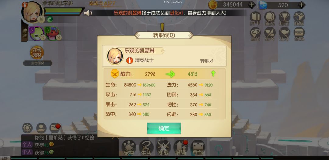 5、在无月卡/年卡加成的情况下,大约推到85-90关即可达到24级,可以参加【挑战】玩法中的【军团试炼】和【守卫精灵谷】了。【守卫精灵谷】可以获得驯宠值,可以在用来兑换宠物或者宠物提升成长可用的信标,可以先攒着,后续宠物成长的时候会需要用到。
