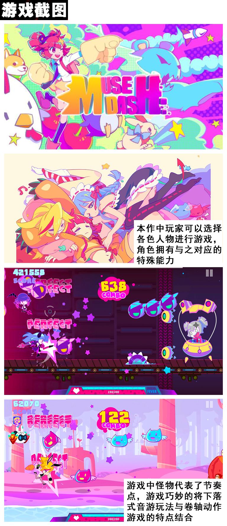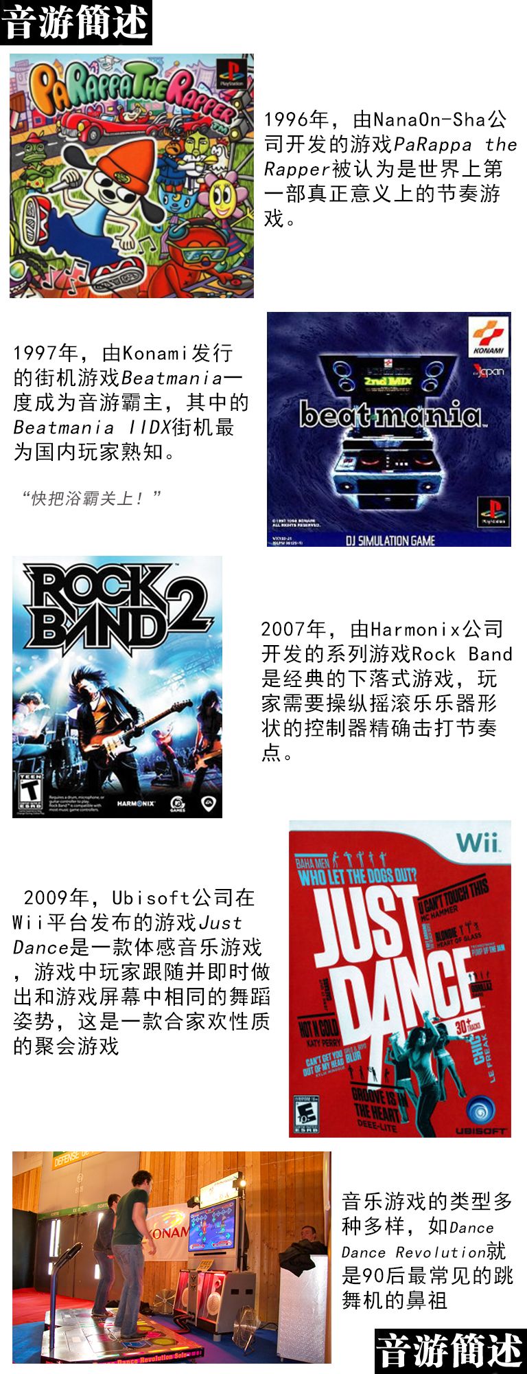(可以跳过,直接进入游戏推荐)音乐游戏(Music Game,简称MUG、音G)是电子游戏类型的一种。玩家配合音乐与节奏做出动作(依画面指示按钮、踏舞步、操作模仿乐器的控制器等)来进行游戏。通常玩家做出的动作与节奏吻合即可增加得分,相反情况下则会扣分或不计分,部分作品甚至会因为有类似血量限制的设定,倘若失误过多,会强制结束游戏(Game Over)。此外某些游戏会要求一定的得分,若无法达成则会结束游戏。游戏的最终目的是追求Full Combo(即没有失准)。