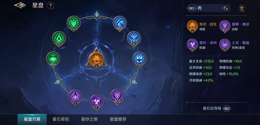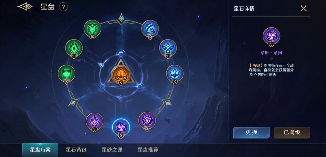 星盘我推荐这套纯肉星盘,本套星盘的最大亮点是出门就很肉。每次升级都会恢复15%最大生命值血量,满级更是能提供965额外生命值(相当于一件防御神装),有了这套星盘,在对抗中让你的对手怀疑人生。抗揍到让人看不懂!