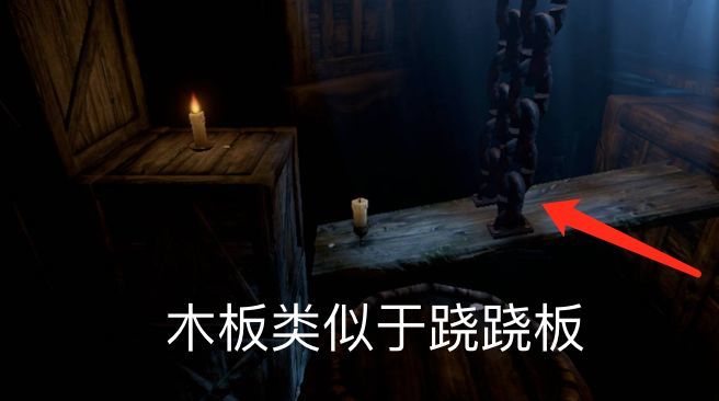接着走会看到一个跷跷板,跳上去如果高度跳不到烛台上就往相反的方向移动,等另一方翘起来,这里就是