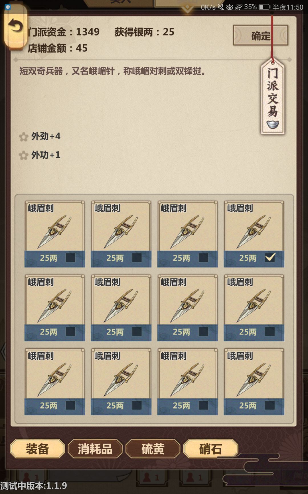 最后默默的提一句,是不是平板不适配啊官方大大,虽然我犹豫了一下还是决定上报,远行中买的峨眉刺,在回途中点了一个把货物送回门派的选项,然后就发现再次远行时一直待在包里按归还只会导致行囊中这件装备越来越多,而且在三旬的黑市中可以以25元的价格卖出去,虽然每次有卖的上限,但是只要远行时刷的够多可以每个月都有的卖的,希望官方能够早日修复bug,游戏越做越好