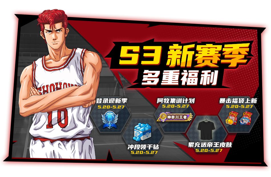 大家好,全新S3赛季来了,怎么能少了新赛季的福利活动呢,除了新赛季冲段丰厚钻石奖励外、灌篮积分赛领取精美MVP头像框、限时兑换帝王特质箱、三井绿色卫衣+仙道风华皮肤返场,喜欢牧绅一的同学不可错过的绝版帝王黑T恤以及代表神奈川至高荣耀的【神奈川王者】称号,新的赛季,新的惊喜,因为有你在,灌篮更精彩。