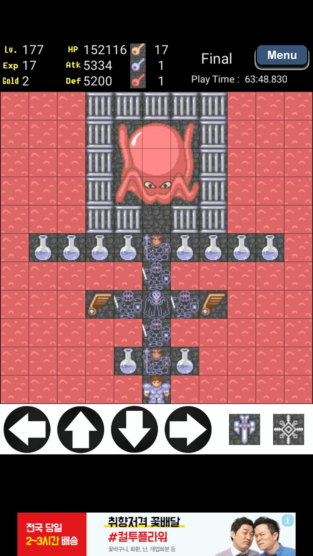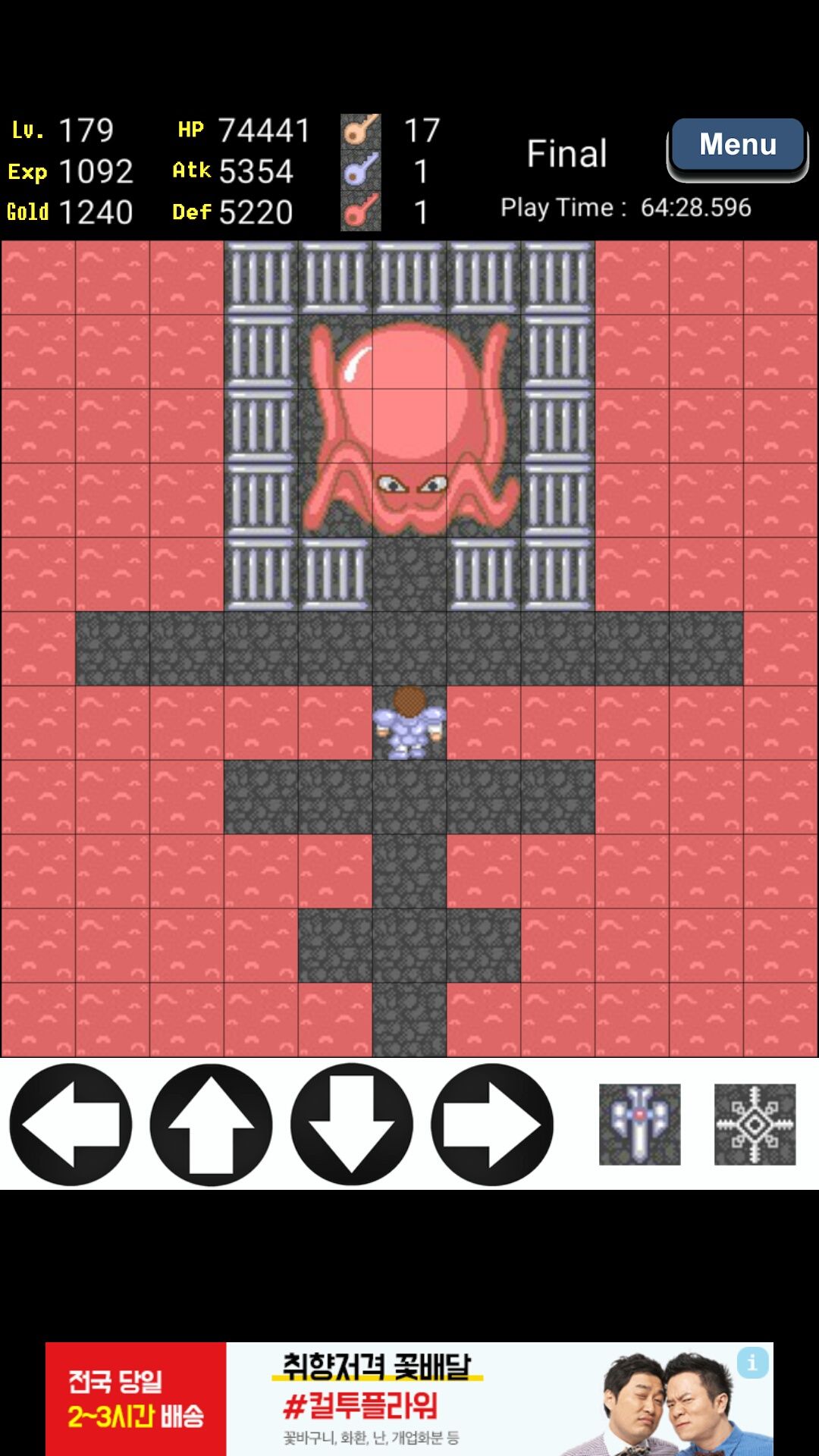 附图,前16层钱全买攻击,经验升3个等级以后全买攻击,到16层以后扫荡楼层,经验全买等级,金币全买防御,打大龙之前一定要找仙女把龙变章鱼,防5000,攻4000以上