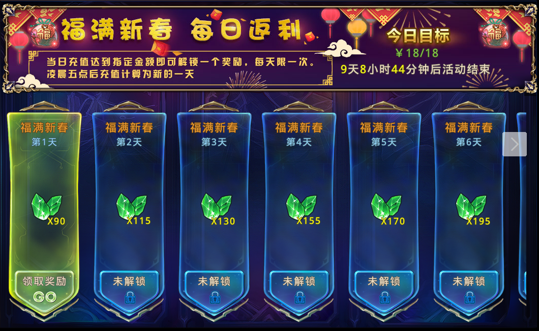 2. 活动期间登陆游戏,每日重置¥18档位充值返利。