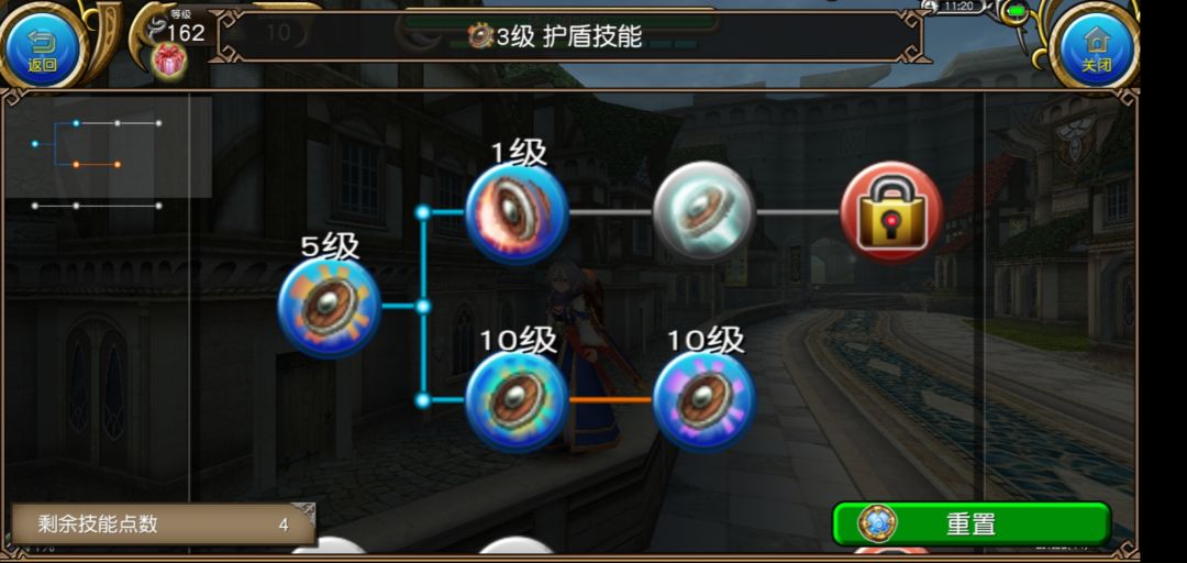 盾牌要领我用了星石,抵消装备盾牌的负面效果,也就是降速,重盾击点1,大概有90%的机率眩晕,双盾各加10%的抗性以及一些血量,输出or生存,请自行选择。(ps:我都说腻了这句话→_→) 另外还有双球和移花,请自行选择,不过要注意技能点消耗哦。