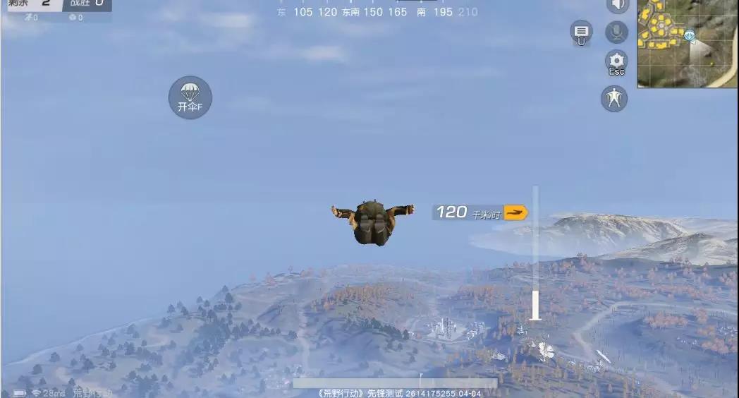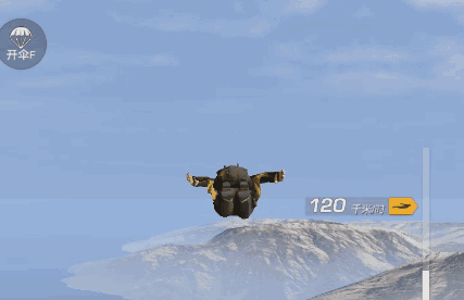 这种飞行姿势适用于长距离的目标点。如图所示,选好目标点后等到飞机与目标点距离成为直线时,选择跳伞,跳伞后将视角拉至与人物平行,平飞的速度最高可达约120km/h。