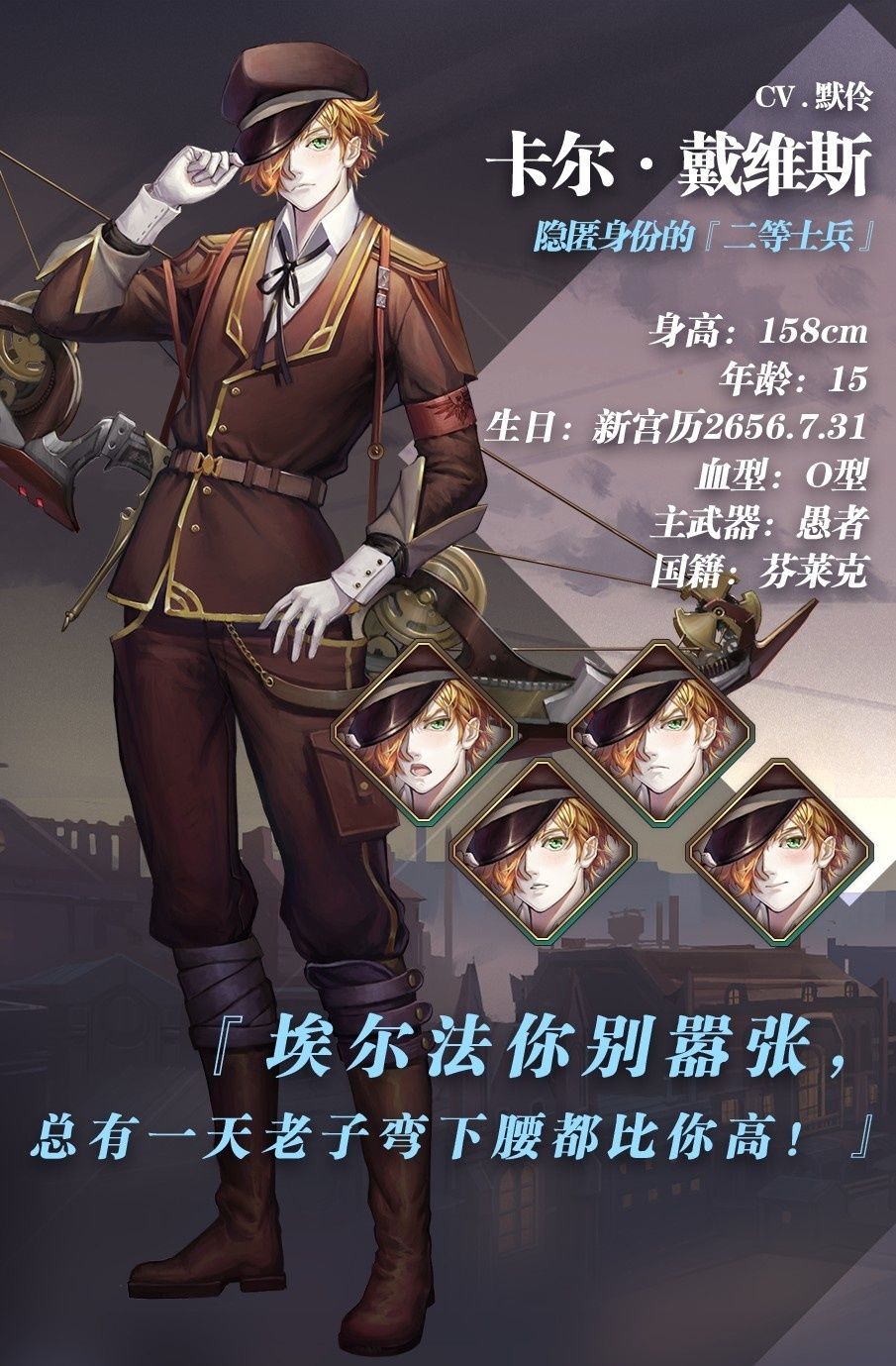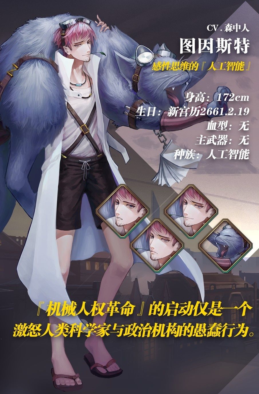 他的机械制造天赋异于常人,擅长制造各类新型战斗机械。面对各类事件都可以从容解决,却在性格方面相当的玩世不恭。虽一直因私生子的身份饱受外界的冷嘲热讽但本人在这方面丝毫不介意。