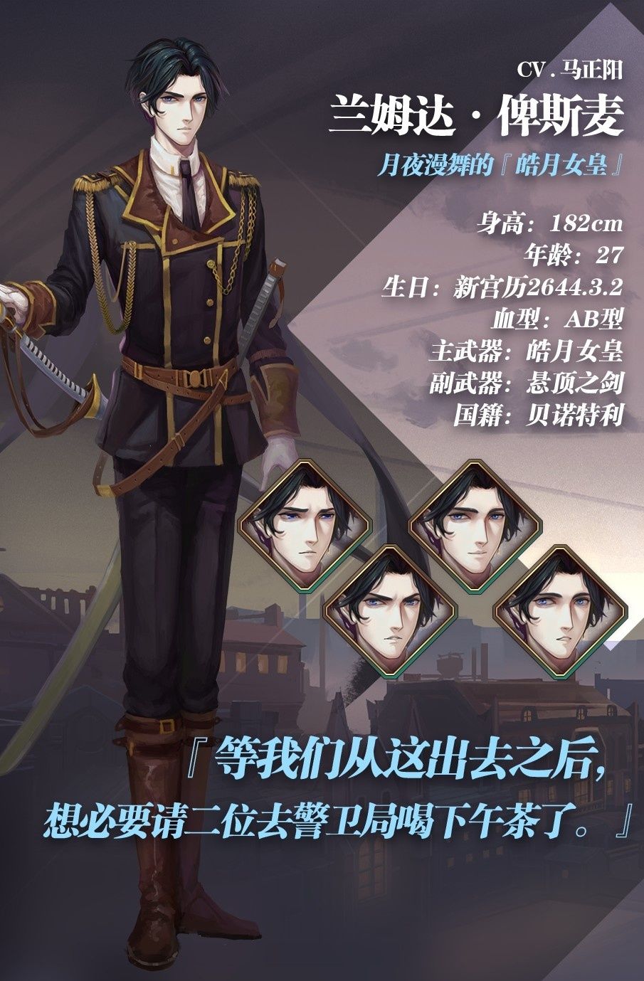 他是埃尔法为数不多的好友之一。现任猎鹰军团上尉,为人正直且严谨。儿时在踏入地狱之门的前一刻被戈鲁迪·俾斯麦少校所救并收养,并获名为兰姆达·俾斯麦。之后在俾斯麦家以养子及门徒的双重身份生活着。虽资质平平但非常勤恳好学,在各方面都很优秀的他也赢得了俾斯麦兄弟的一致认可与宠爱。
